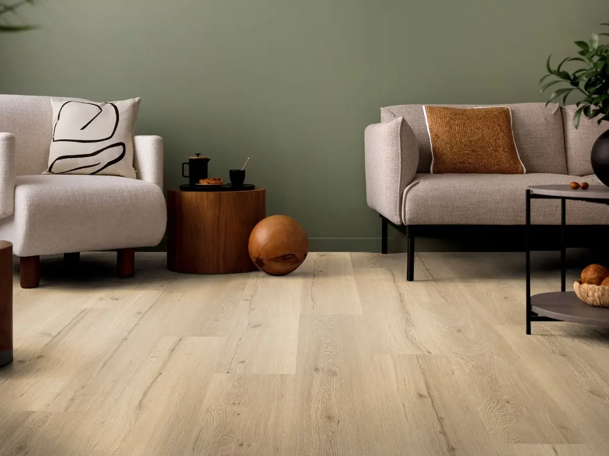 Klick‑Designboden in cremefarbener Eichenoptik mit Breitdiele, R10‑Rutschhemmung und einfacher Verlegung – ideal für moderne Wohnräume