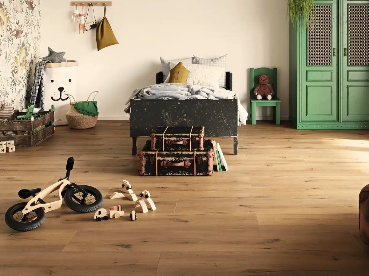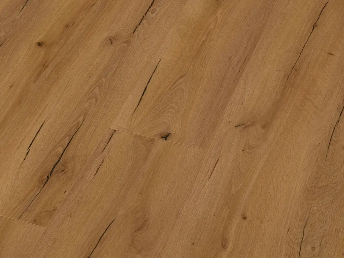 Wohngesunde Klickdiele in Eicheoptik – emissionsfrei, PVC-frei, pflegeleicht & für Feuchträume geeignet. Extra großes XL-Dielenformat.