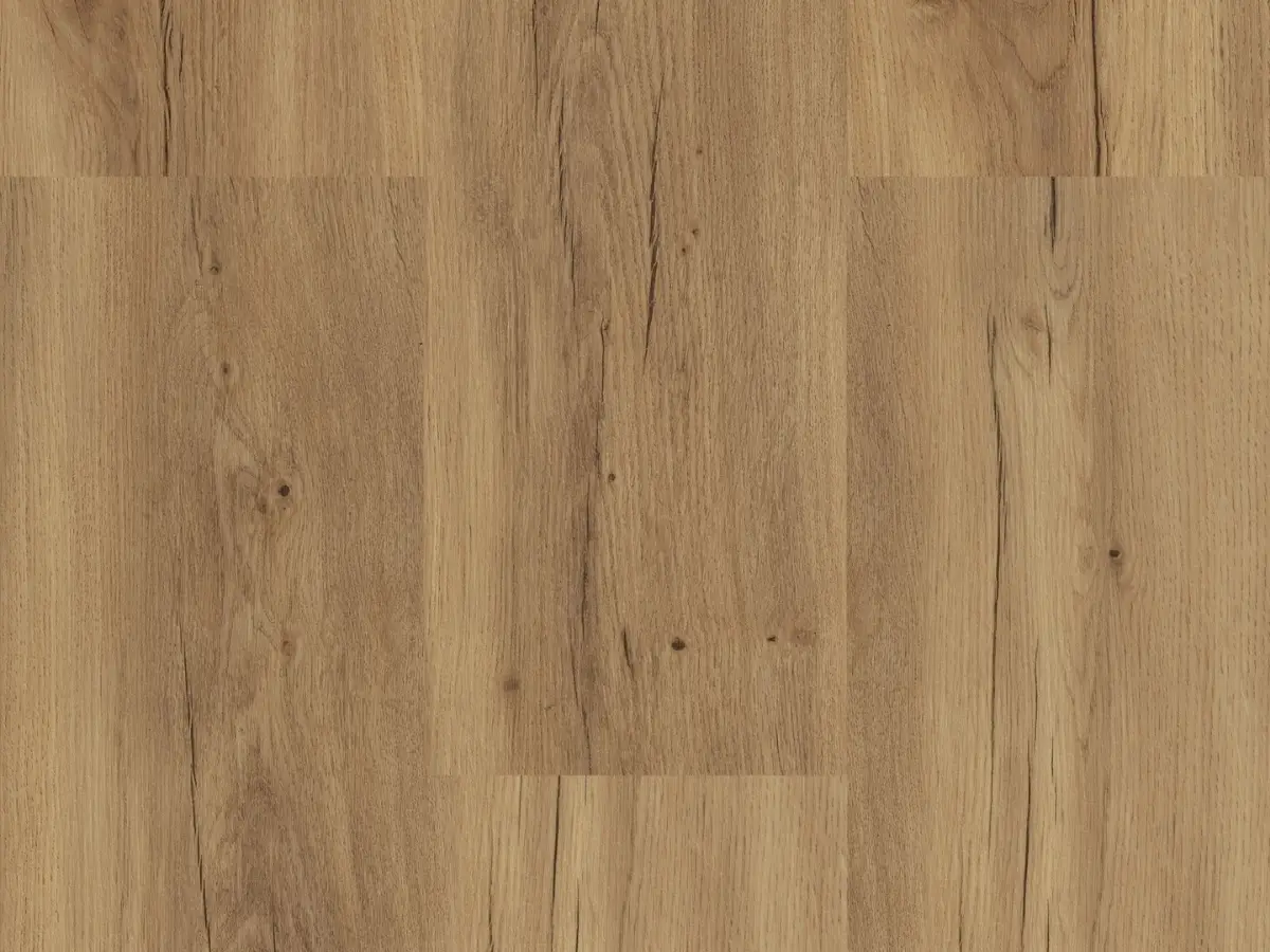 Warmer Designboden in Wildeiche‑Optik mit natürlicher Haptik, 9,5 mm stark mit integrierter Trittschalldämmung – ideal für gemütliche Wohnräume.