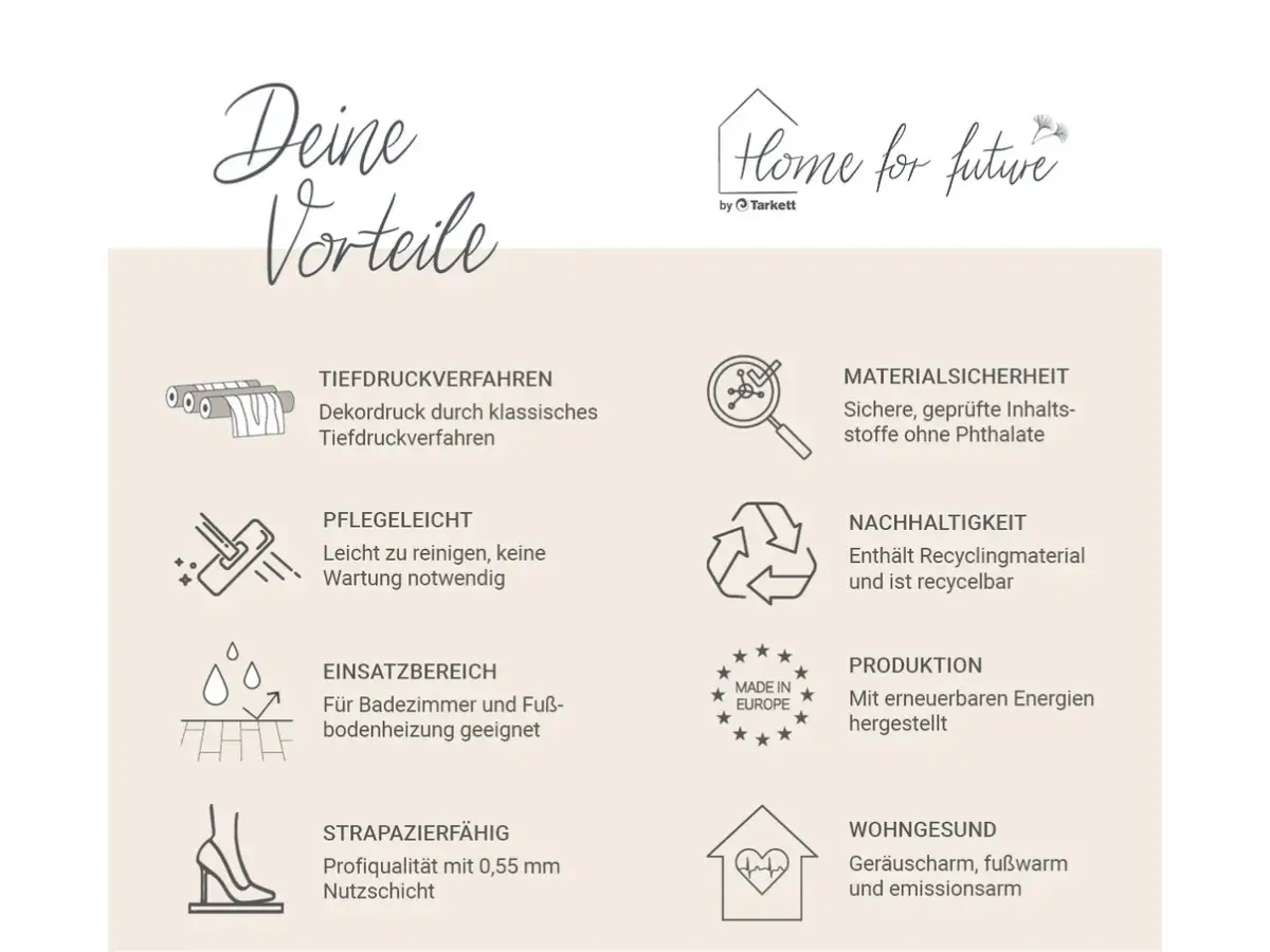 | Warmwasser‑Fußbodenheizung geeignet | ja (max. 27 °C Oberflächentemperatur) |