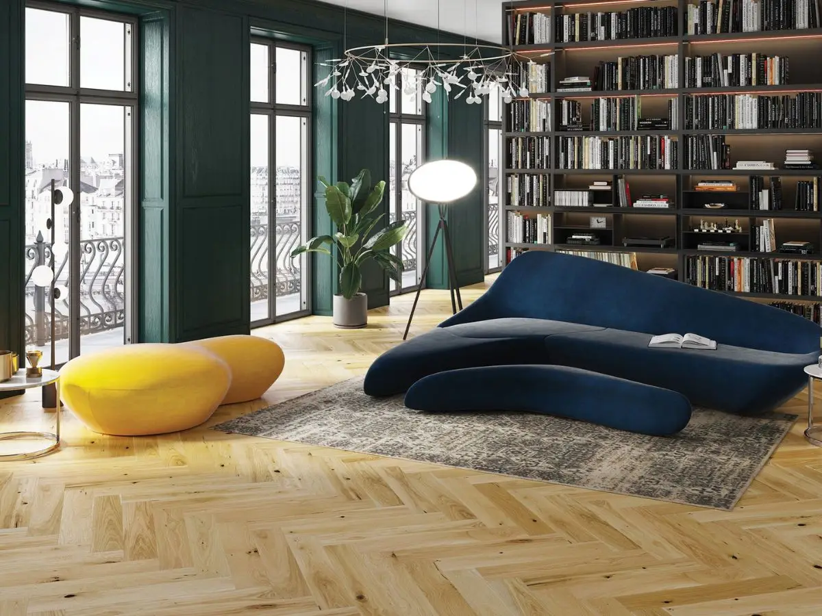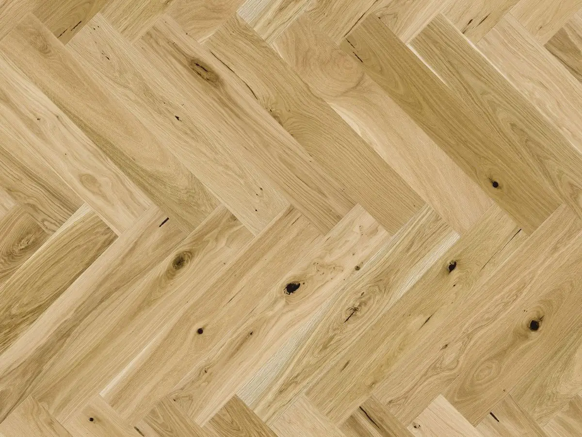 Elegantes Fischgrät‑Fertigparkett aus Eiche, geölt und gebürstet, mit Micro‑Fase rundum. Ideal für Wohnräume mit Anspruch an Stil & Natürlichkeit – wertige Qualität, warm unter den Füßen und geeignet für Fußbodenheizung.